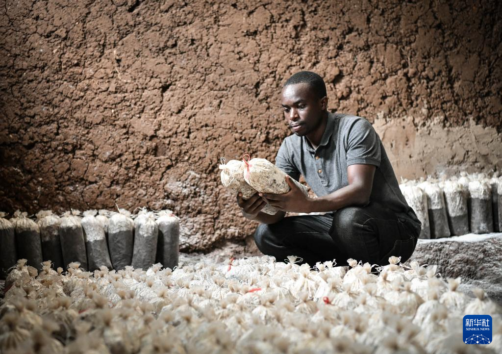 8月14日,在卢旺达南方省穆汉加区,尼扬博·奥贝德在食用菌培育工坊内检查菌袋。曾两次赴中国进行菌草技术培训的尼扬博·奥贝德在南方省和东方省各拥有一家工坊。