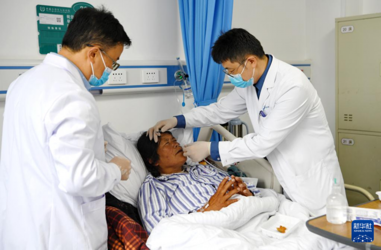 9月1日,王克明博士(右)和西藏自治区人民医院医生为患者换药。