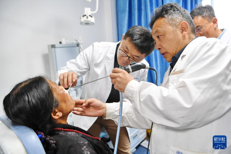 8月27日,王克明博士和西藏自治区人民医院医生为一名农牧民查体。