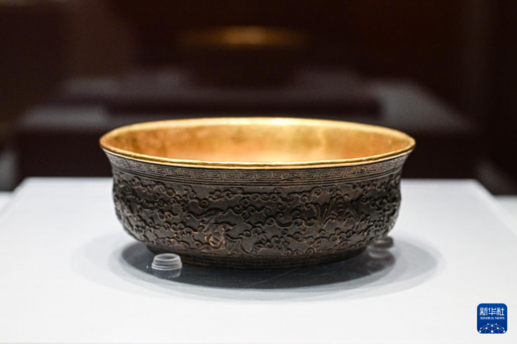8月31日在海南省博物馆拍摄的“物华天宝 黎海琼珍——故宫博物院藏海南文物特展”展出的清代椰子木雕云蝠纹镶金里碗。