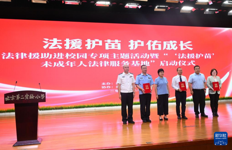 9月2日,北京市司法局联合多家单位在北京第二实验小学举办“法援护苗 护佑成长”法律援助进校园专项主题活动,通过开学第一课的形式,将法治教育融入学生日常,为未成年人的健康成长保驾护航。这是北京市司法局为“‘法援护苗’未成年人法律服务基地”授牌。