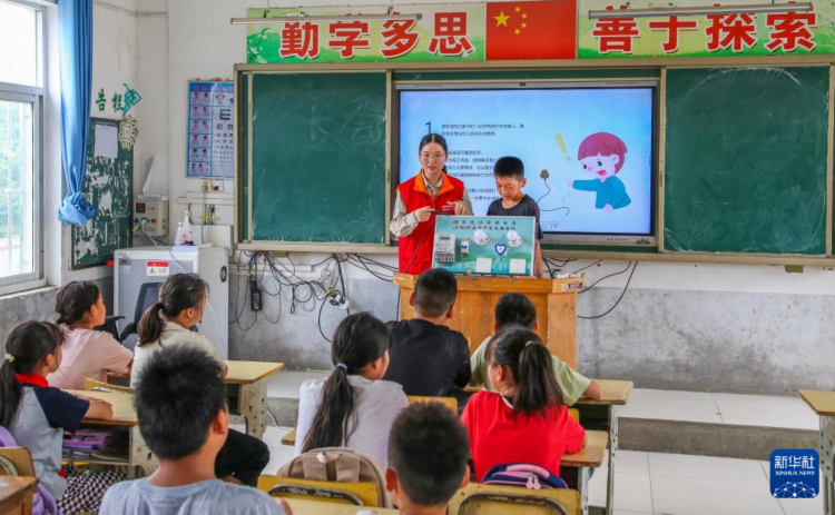 9月2日,在安徽省合肥市长丰县水湖镇江淮汽车希望小学,国网安徽电力共产党员服务队队员为学生讲解安全用电知识。