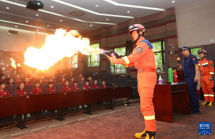 9月2日,上海市长宁区消防救援支队走进上海市延安初级中学,通过结合火场案例的理论知识和消防器材体验等互动环节,为同学们带来一堂生动有趣的“开学第一课”。这是消防员(前)在向同学们演示家用杀虫剂的起火威力。