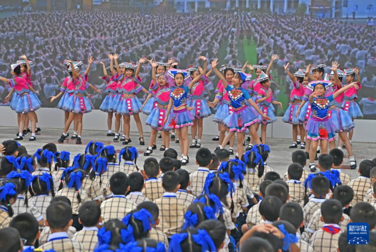 9月2日,孩子们在广西南宁市滨湖路小学举行的主题为“民族团结一家亲 童心共筑中国梦”的2024年秋季学期开学仪式上表演节目。