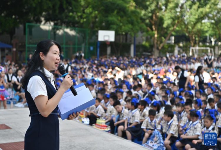 9月2日,广西南宁市滨湖路小学校长谢小燕在给孩子们讲思政课。
