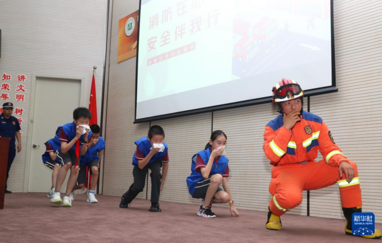 9月2日,上海市长宁区消防救援支队走进上海市延安初级中学,通过结合火场案例的理论知识和消防器材体验等互动环节,为同学们带来一堂生动有趣的“开学第一课”。这是同学们向消防员(右)学习火场的疏散技巧。