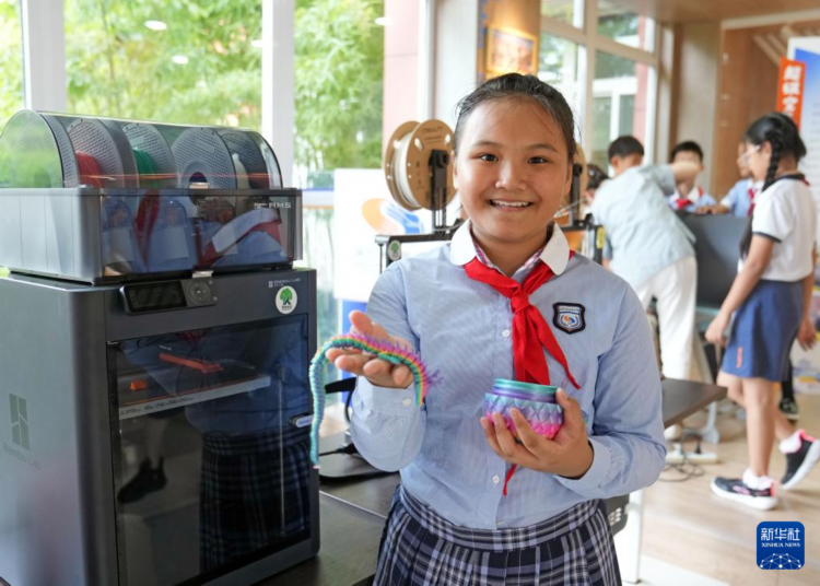 9月2日,闵行区实验小学(畹町校区)五年级学生王梓菱在展示科创小组活动中用3D打印机制作的小玩具“有小恐龙的恐龙蛋”。