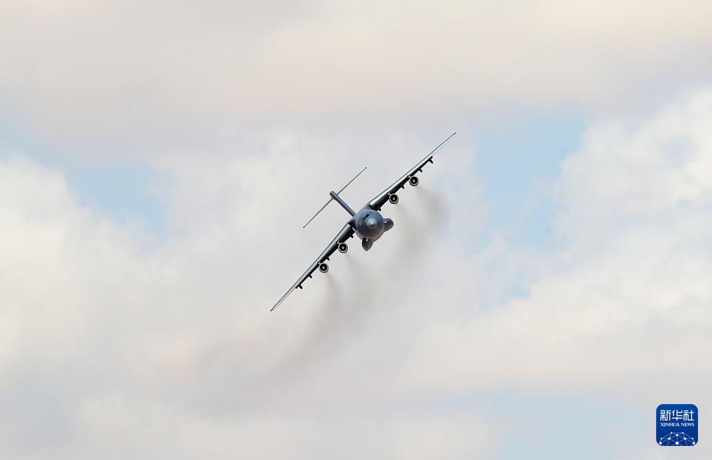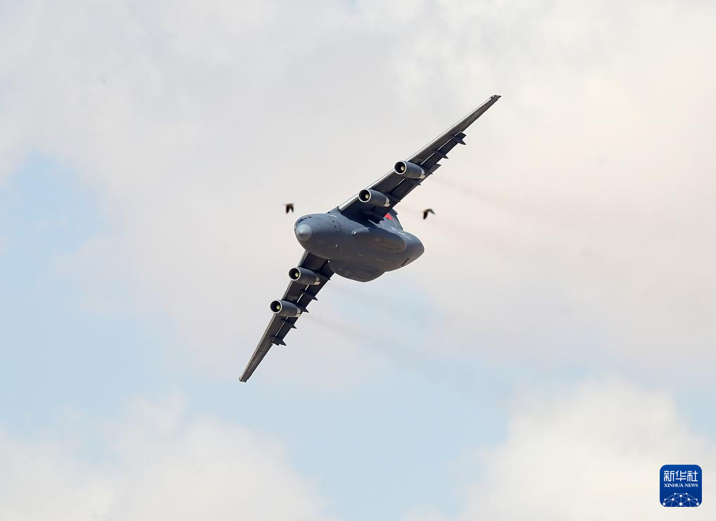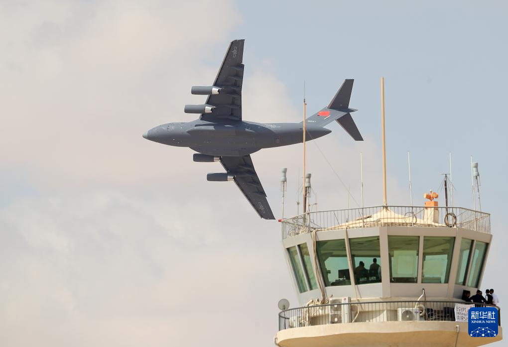9月3日,在埃及阿拉曼开幕的首届埃及航展上,中国空军运-20进行飞行展示。 中国空军亮相3日在埃及阿拉曼开幕的首届埃及航展,运-20进行飞行展示,八一飞行表演队歼-10表演机静态展示,充分展现自信开放的风采。 新华社记者 王东震 摄
