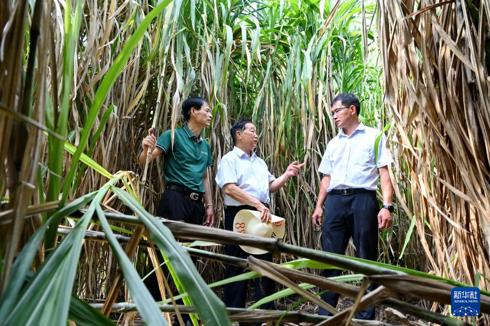 新华全媒+丨向非洲传播菌草技术的使者 8月28日,林占熺教授(中)和菌草研究团队成员林辉(右)在福建省永泰县清凉镇的“珍农菌草富泉羊循环产业示范基地”查看菌草的生长情况。 新华社记者 林善传 摄