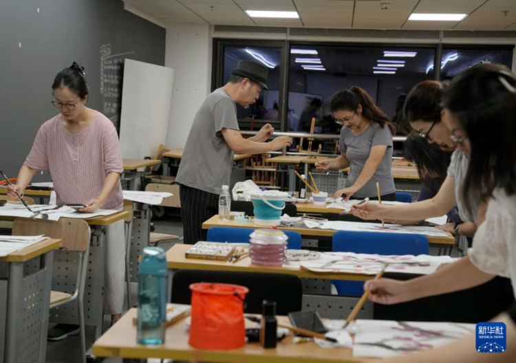 9月2日晚,在上海市群众艺术馆,夜校学员在国画提高班上课。