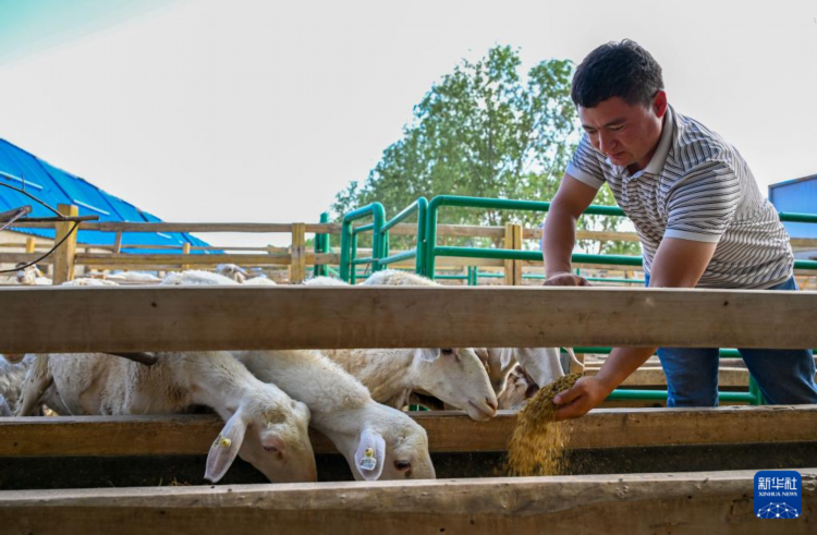 9月4日,在新疆昆玉市玉园镇和泰新区多胎肉羊养殖基地,养殖户西尔尼亚孜·米吉提在喂羊。和泰新区通过引入多胎萨福克种公羊与湖羊、皮山红羊、和田羊等羊种杂交改良,提升产羔率。