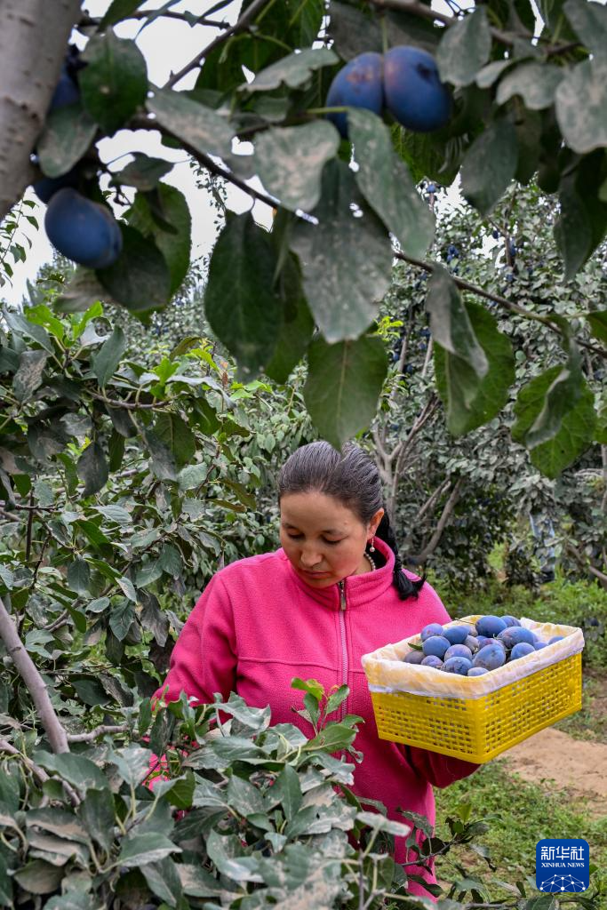 9月4日,农民在新疆昆玉市老兵镇一家种植园内采摘西梅。
