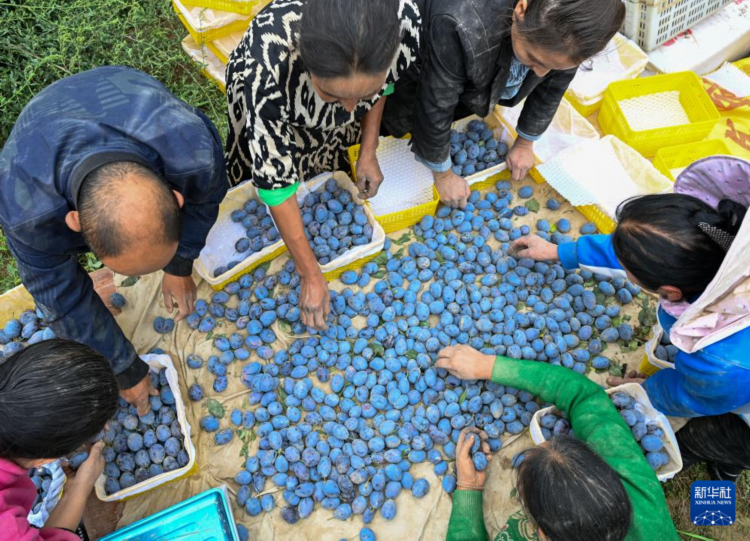 9月4日,农民在新疆昆玉市老兵镇一家种植园内挑选西梅并装箱。