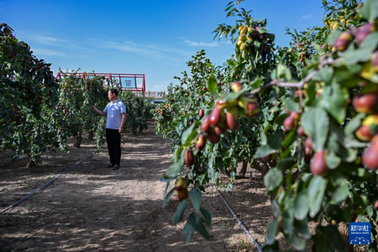 9月4日,在新疆昆玉市玉园镇一家枣园,种植户刘福春在查看骏枣长势。