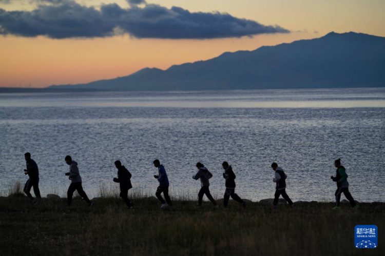 运动员在赛里木湖畔进行野外训练(8月31日摄)。