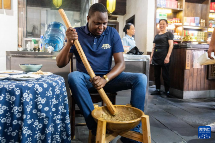 9月3日,在常德河街,外国游客体验非遗美食擂茶的制作。