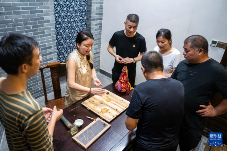 9月3日,在常德河街,外国游客体验非遗麻质画制作。