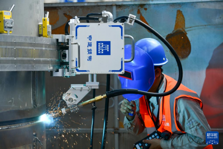 9月5日,工作人员遥控智能焊接机器人进行焊接作业。