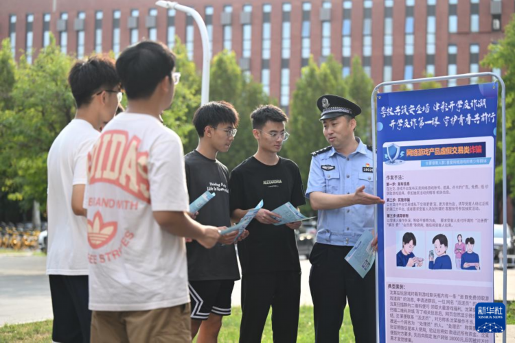 9月5日,在天津大学北洋园校区,公安民警为大学生宣传网络游戏产品虚假交易类诈骗防范知识。