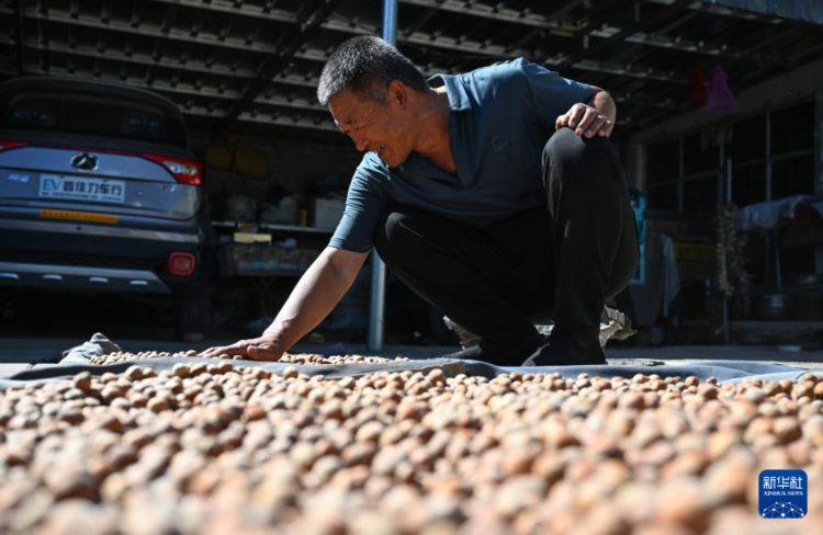 9月5日,农民在内蒙古兴安盟突泉县六户镇新合村晾晒榛子。