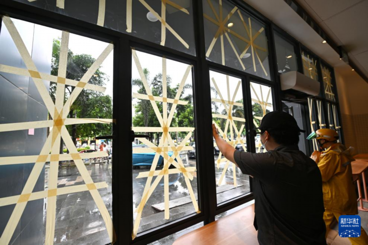 9月5日,海口市一家餐馆的员工加固玻璃窗。