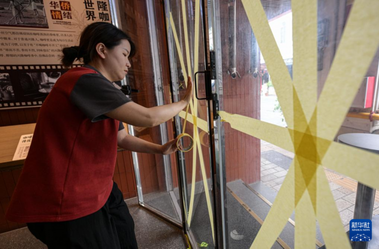 9月5日,海南省海口市一家咖啡店的工作人员在加固玻璃。