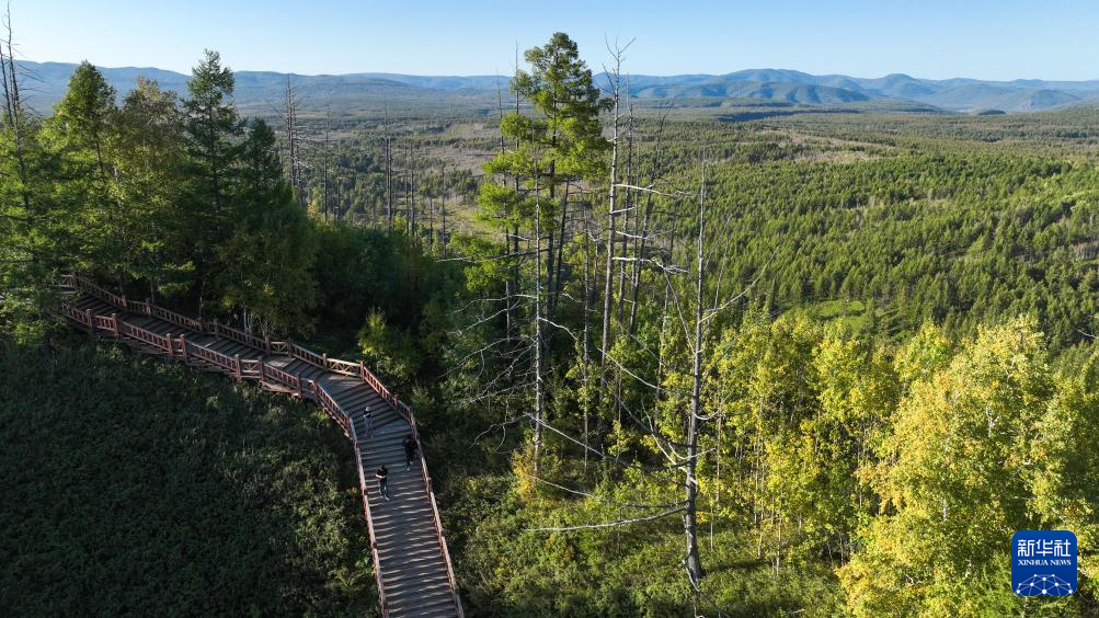 近日,内蒙古兴安盟阿尔山市的阿尔山国家森林公园内秋意渐浓,吸引游客前来赏景游玩。
