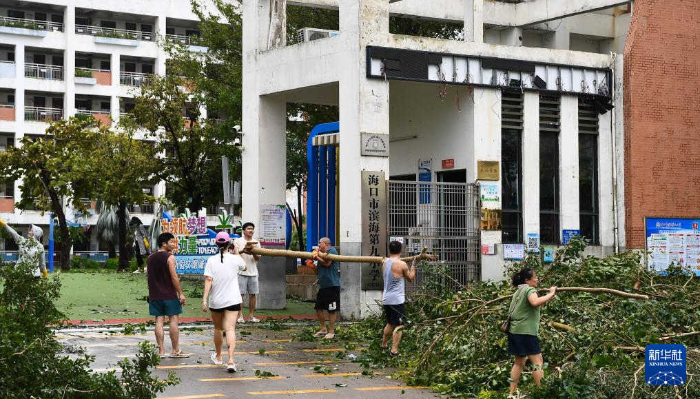 9月7日,在海口市滨海第九小学,工作人员在校园周边清理。
