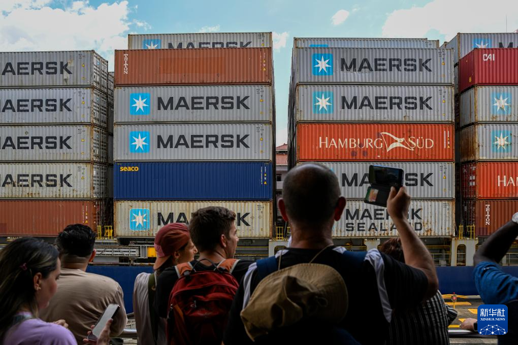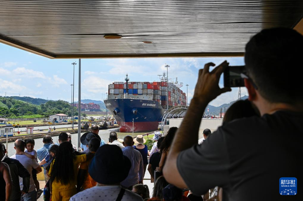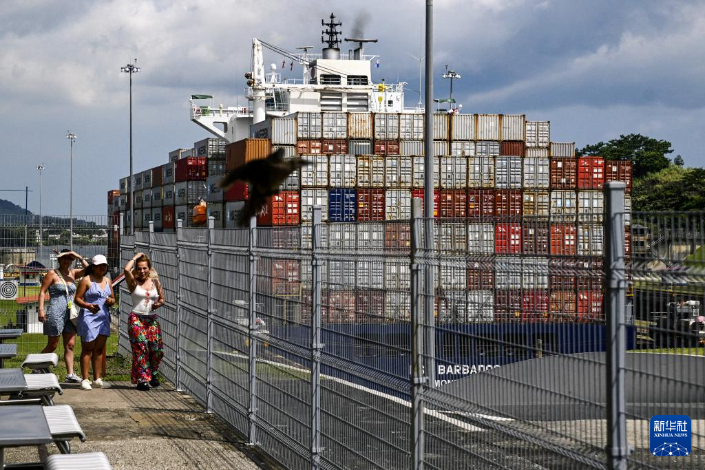 8月28日,在巴拿马首都巴拿马城附近,游客在巴拿马运河的米拉弗洛雷斯船闸游客中心观看货轮通过船闸驶入太平洋。 巴拿马运河连接太平洋与大西洋,全长80余公里,是全球重要贸易水道之一。巴拿马运河于1914年8月15日通航,今年巴拿马运河迎来通航110周年。 新华社记者 李木子 摄