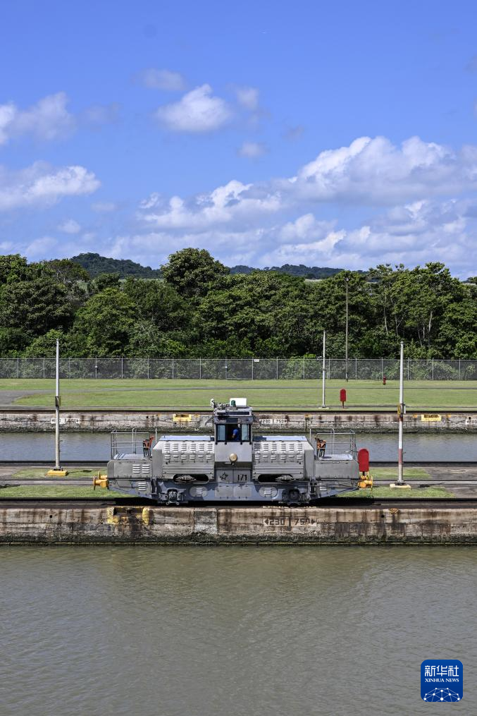 这是8月28日在巴拿马首都巴拿马城附近拍摄的巴拿马运河米拉弗洛雷斯船闸的轨道牵引机。 巴拿马运河连接太平洋与大西洋,全长80余公里,是全球重要贸易水道之一。巴拿马运河于1914年8月15日通航,今年巴拿马运河迎来通航110周年。 新华社记者 李木子 摄