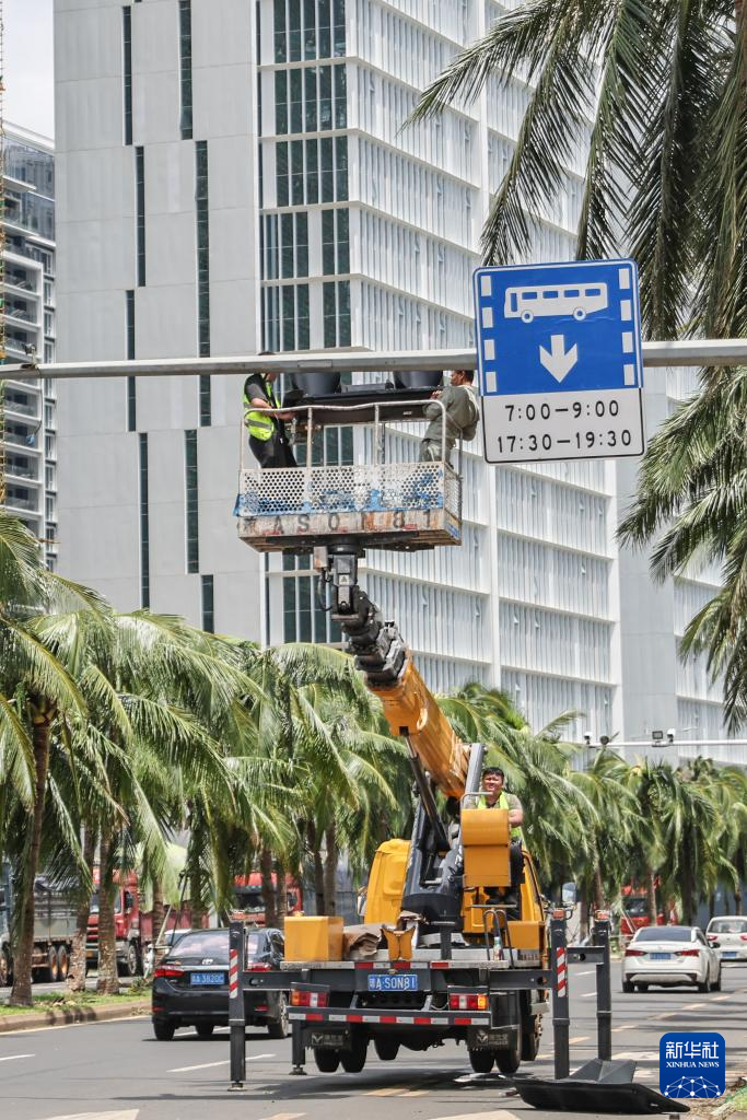 9月8日,市政部门工作人员在海口市滨海大道上抢修交通信号灯。