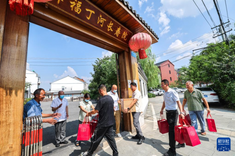 9月8日,杭州市临平区塘栖镇的流动党员带着糕点和月饼到幸福丁河长寿院看望这里的孤寡老人。