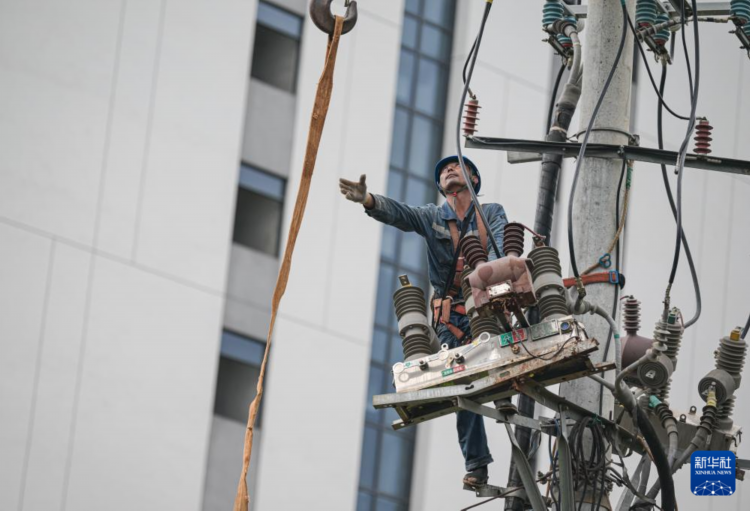 9月9日,在海南省澄迈县一处电力线路抢修现场,工人操作机械吊运需要更换的配件。