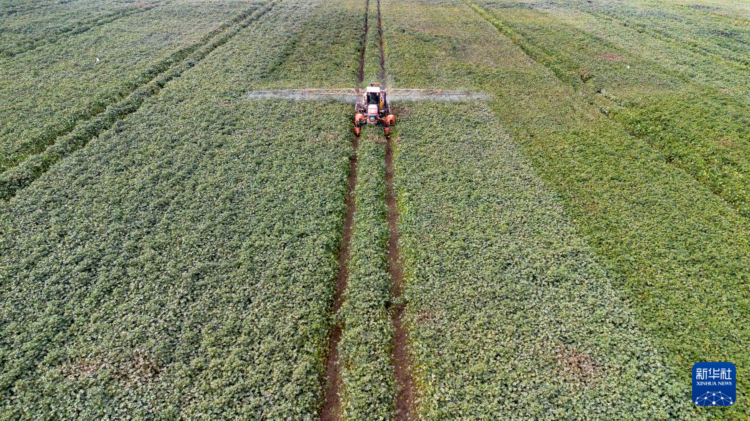 9月9日,在新疆生产建设兵团第一师阿拉尔市十一团花桥镇,农民驾驶农机为棉花喷洒脱叶剂。该地块共128亩,由种植户韩帮儿、高银芳和陈志林共同承包。