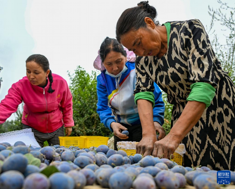 9月4日,新疆生产建设兵团第十四师昆玉市七十四团老兵镇种植户在挑选和打包刚刚采摘的西梅。