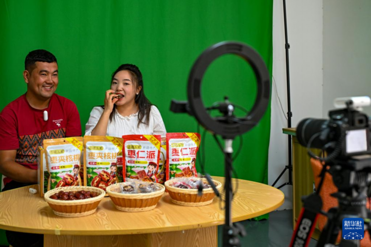 9月8日,新疆喀什地区巴楚县疆玉果食品加工专业合作社职工在直播带货。这家合作社由兵团和地方共同设立,将海安镇种植的红枣和巴楚县恰尔巴格乡阿勒台买里村种植的核桃进行加工售卖。