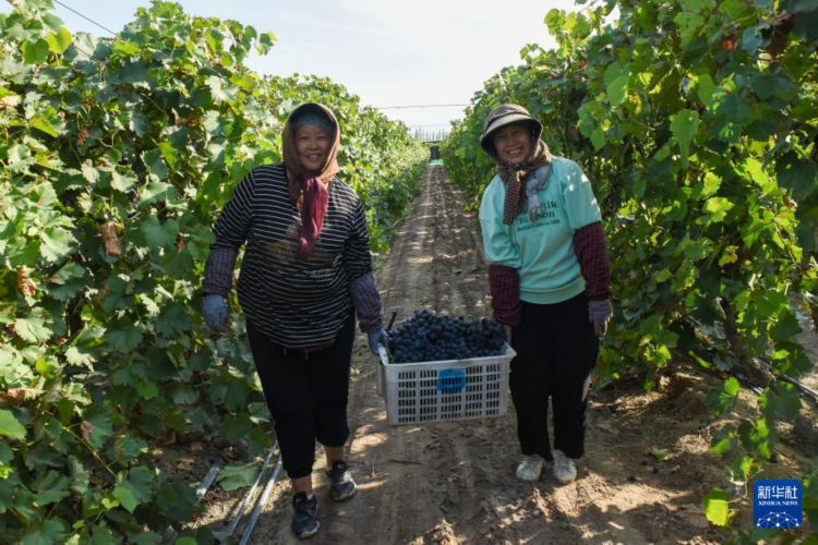 9月6日,新疆生产建设兵团第五师双河市八十一团双桥镇的果农在运送葡萄。