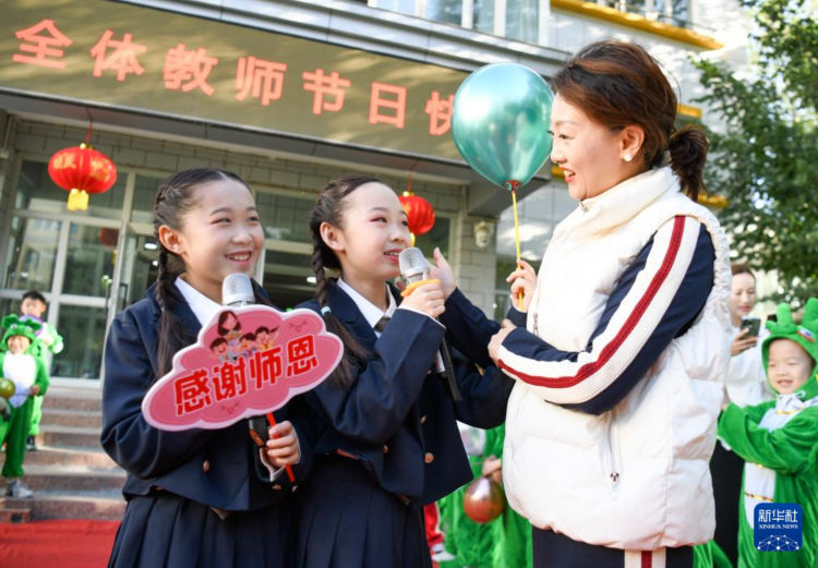 9月10日,在新疆教育学院实验小学校园,学生为老师献歌送上祝福。