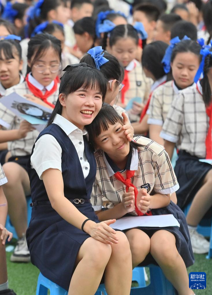9月10日,在新疆教育学院实验小学校园,老师收获学生的祝福。