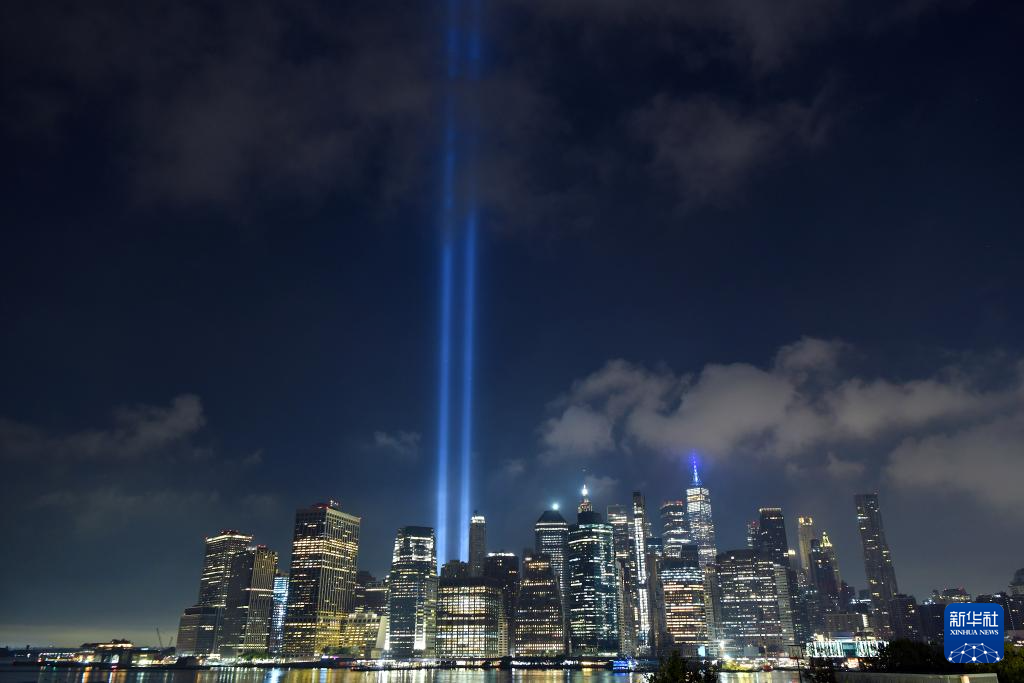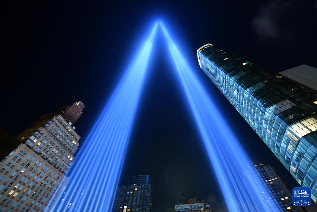 9月11日晚,美国纽约世贸中心遗址附近亮起象征纽约世贸中心“双子塔”大厦的光柱,纪念“9·11”恐怖袭击事件二十三周年。 新华社记者 李睿 摄