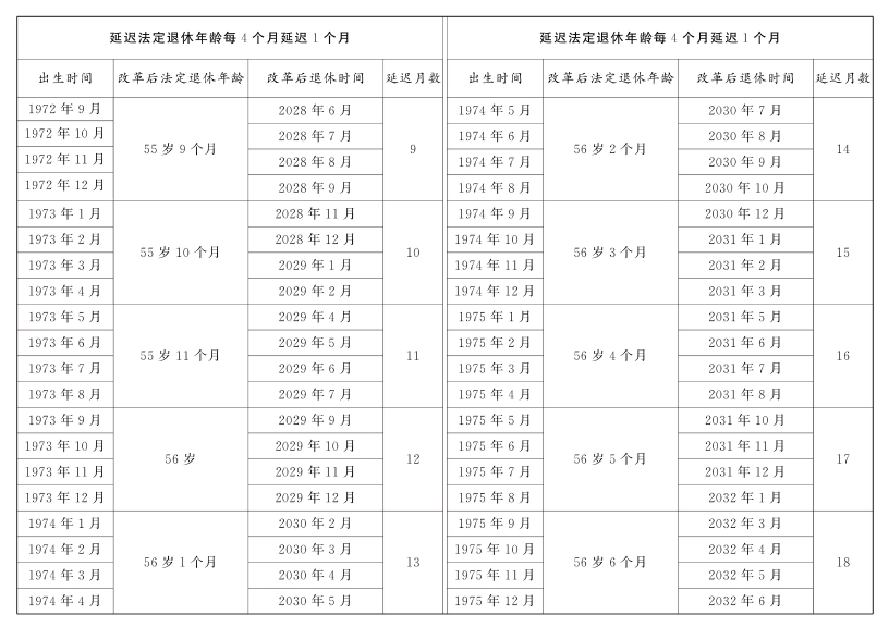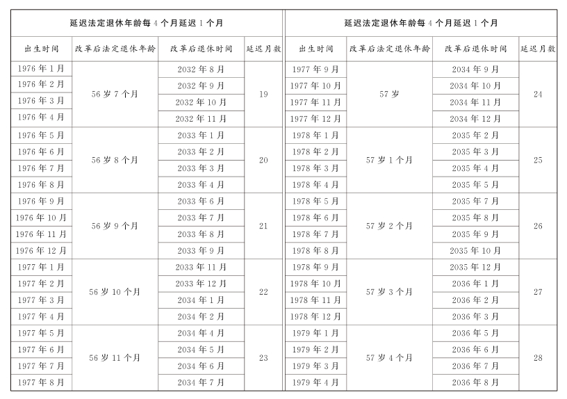 第一条 从2025年1月1日起,男职工和原法定退休年龄为五十五周岁的女职工,法定退休年龄每四个月延迟一个月,分别逐步延迟至六十三周岁和五十八周岁;原法定退休年龄为五十周岁的女职工,法定退休年龄每二个月延迟一个月,逐步延迟至五十五周岁。国家另有规定的,从其规定。