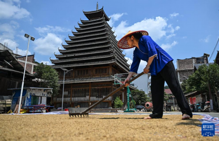 吴春月在三江侗族自治县良口乡产口村晒稻谷(8月29日摄)。