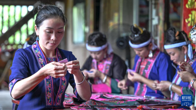 吴春月在三江侗族自治县同乐苗族乡同乐村的绣坊学习侗族刺绣(8月30日摄)。