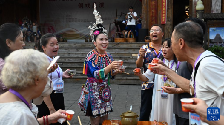 在三江侗族自治县程阳八寨岩寨的百家宴上,吴春月(中)在教游客唱侗家敬酒歌(8月28日摄)。