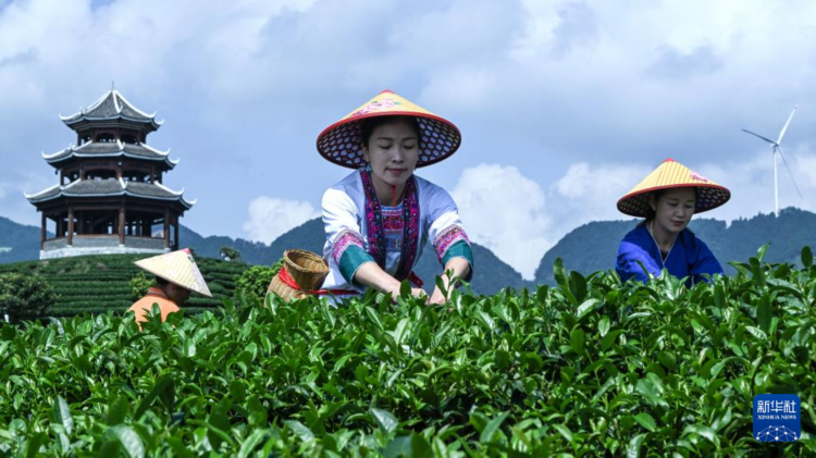 吴春月(中)在三江侗族自治县的布央茶园采茶体验生活(8月31日摄)。