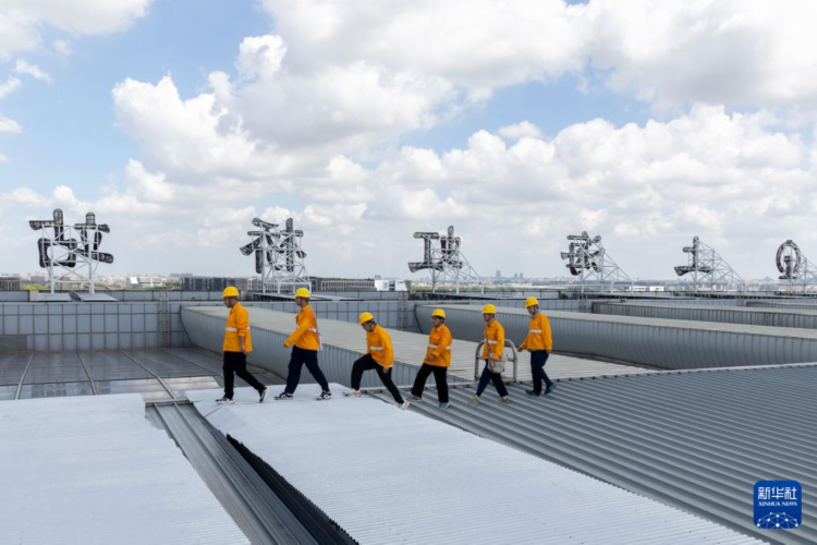 9月13日,房建巡检工在上海虹桥火车站屋顶上作业。
