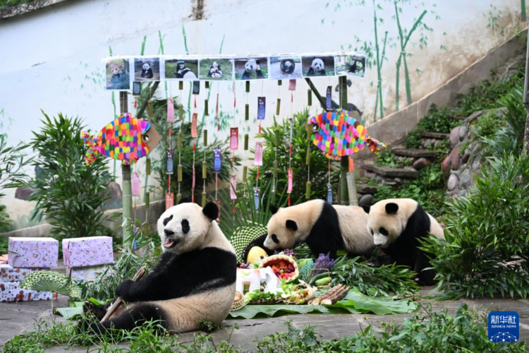 当日,中国大熊猫保护研究中心雅安基地为近期过生日的熊猫准备了一场集体生日会,饲养员们结合中秋节主题,精心准备了月饼窝窝头、水果拼盘、竹笋蛋糕及茶具茶桌等。