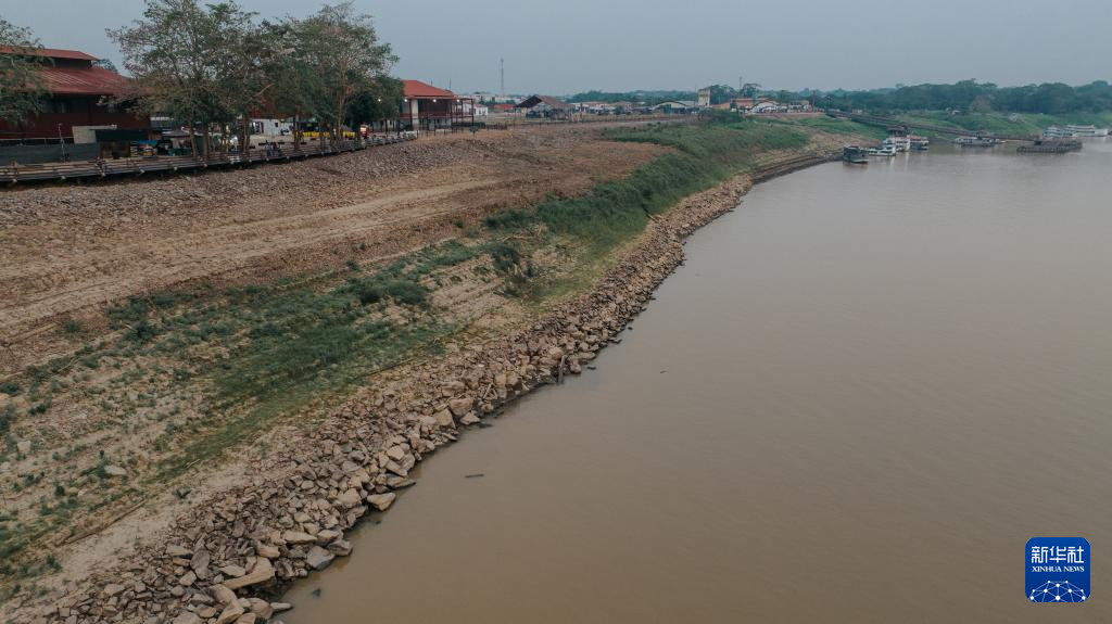 这是9月12日在巴西朗多尼亚州波多韦柳拍摄的马代拉河(无人机照片)。巴西地质调查局的数据显示,亚马孙河流域的马代拉河已经达到历史最低水位。