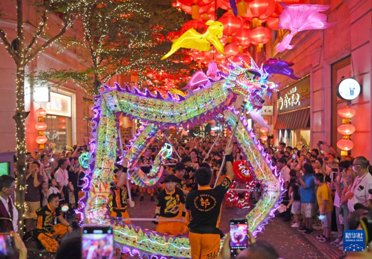 9月17日,人们在香港利东街观看舞龙表演,欢庆中秋佳节。