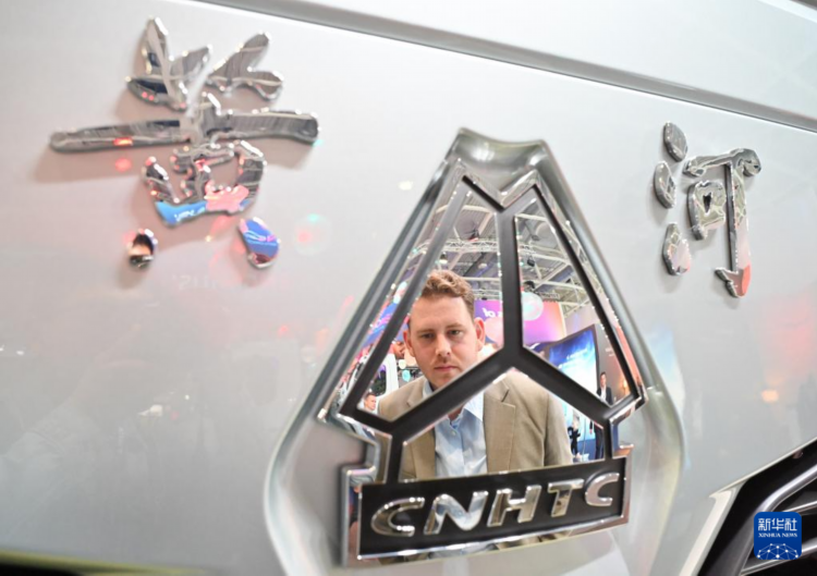 9月17日,在德国汉诺威国际交通运输博览会上,一名男子在中国重汽展区了解黄河X7氢燃料牵引车。